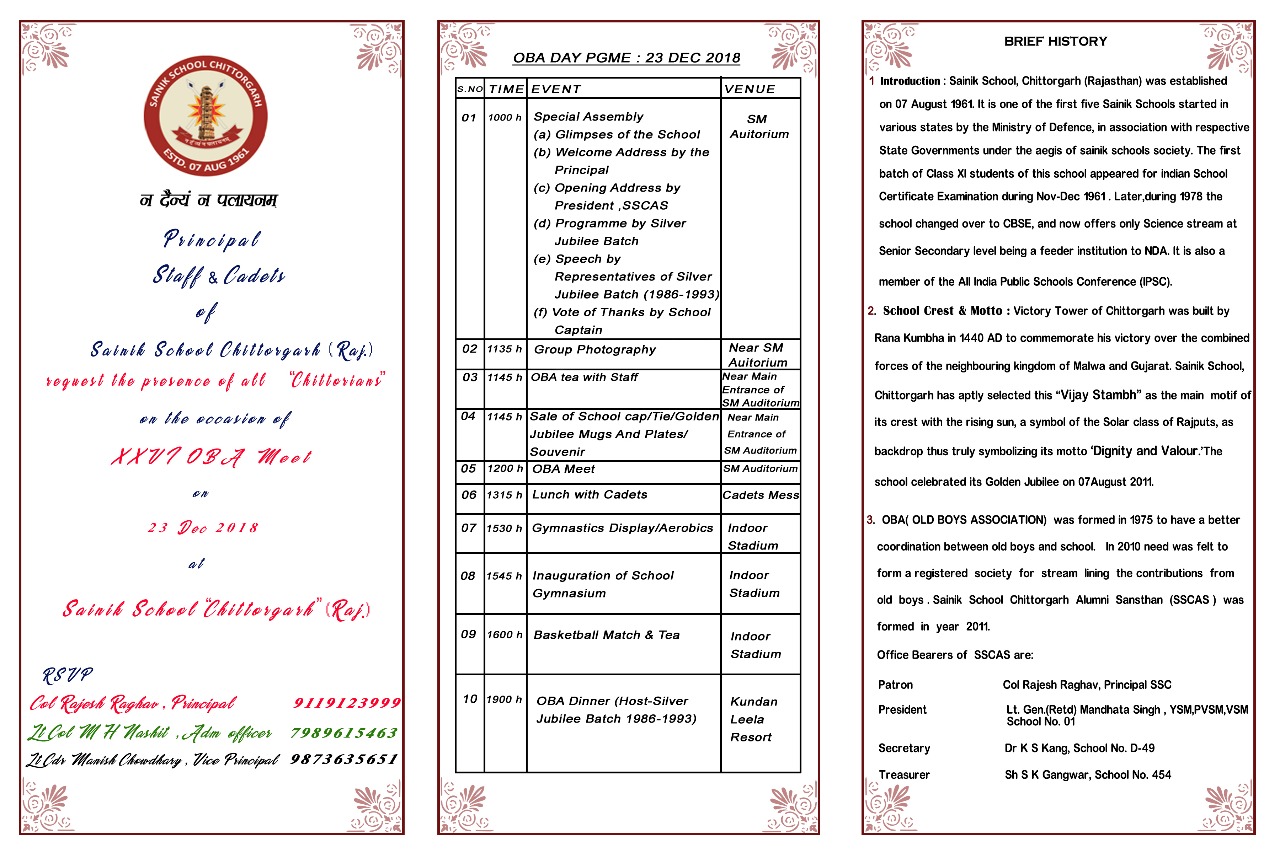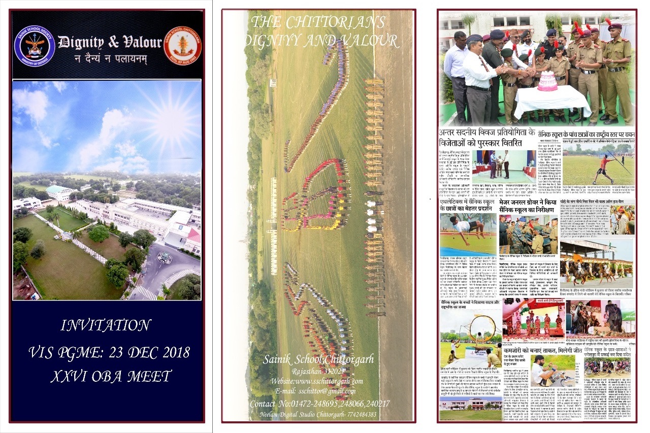 Sainik School Chittorgarh Alumni Sansthan (OBA) , Principal Sainik School Chittorgarh and Members of 2018 Silver Jubilee Batch invite all the Ex Chittorians with family to the 26th OBA meet of Sainik School Chittorgarh is going to be held on 23 Dec 2018 . 1986 - 1993 batch will be celebrating Silver jubilee of their completing studies in the school.